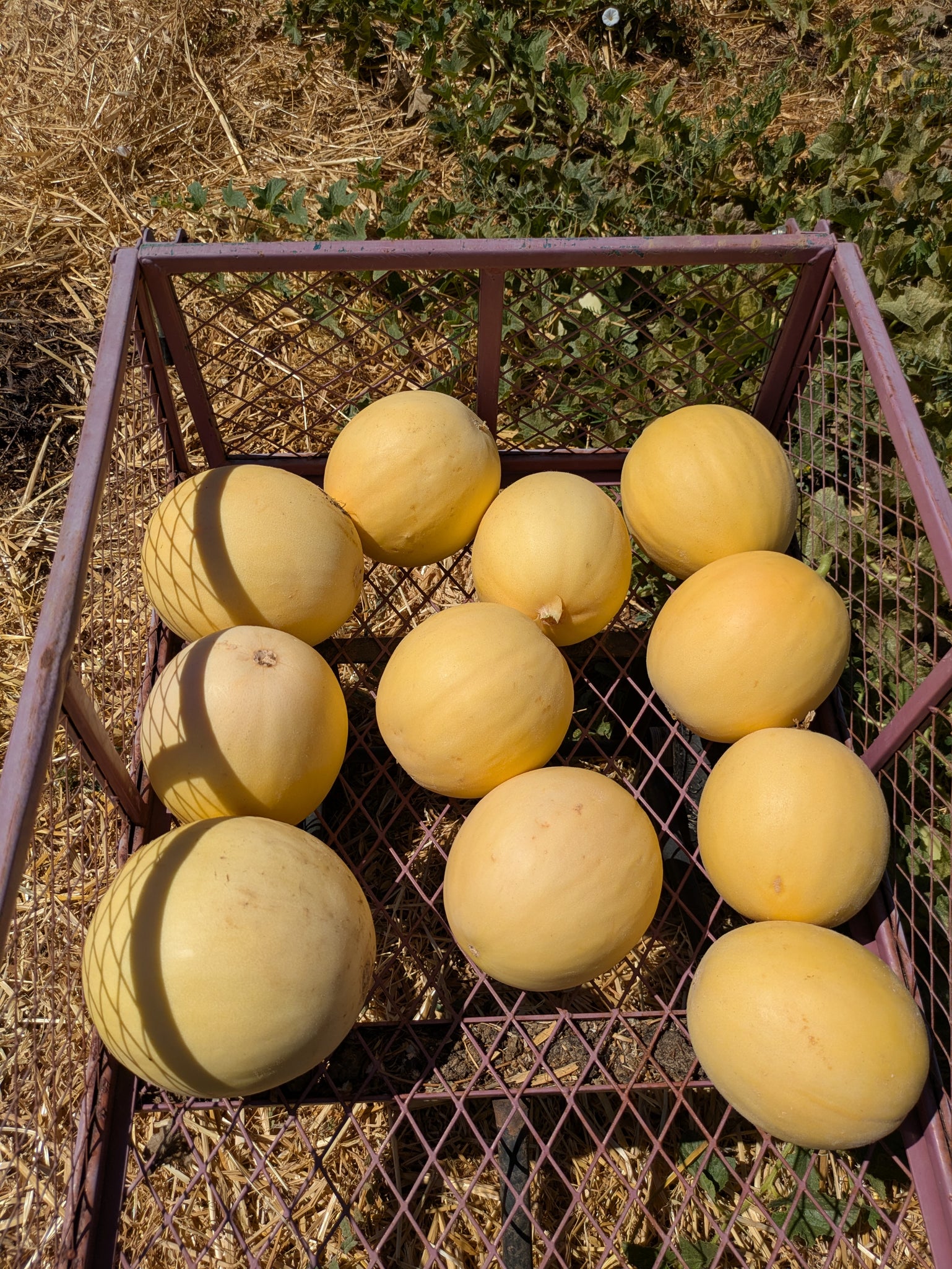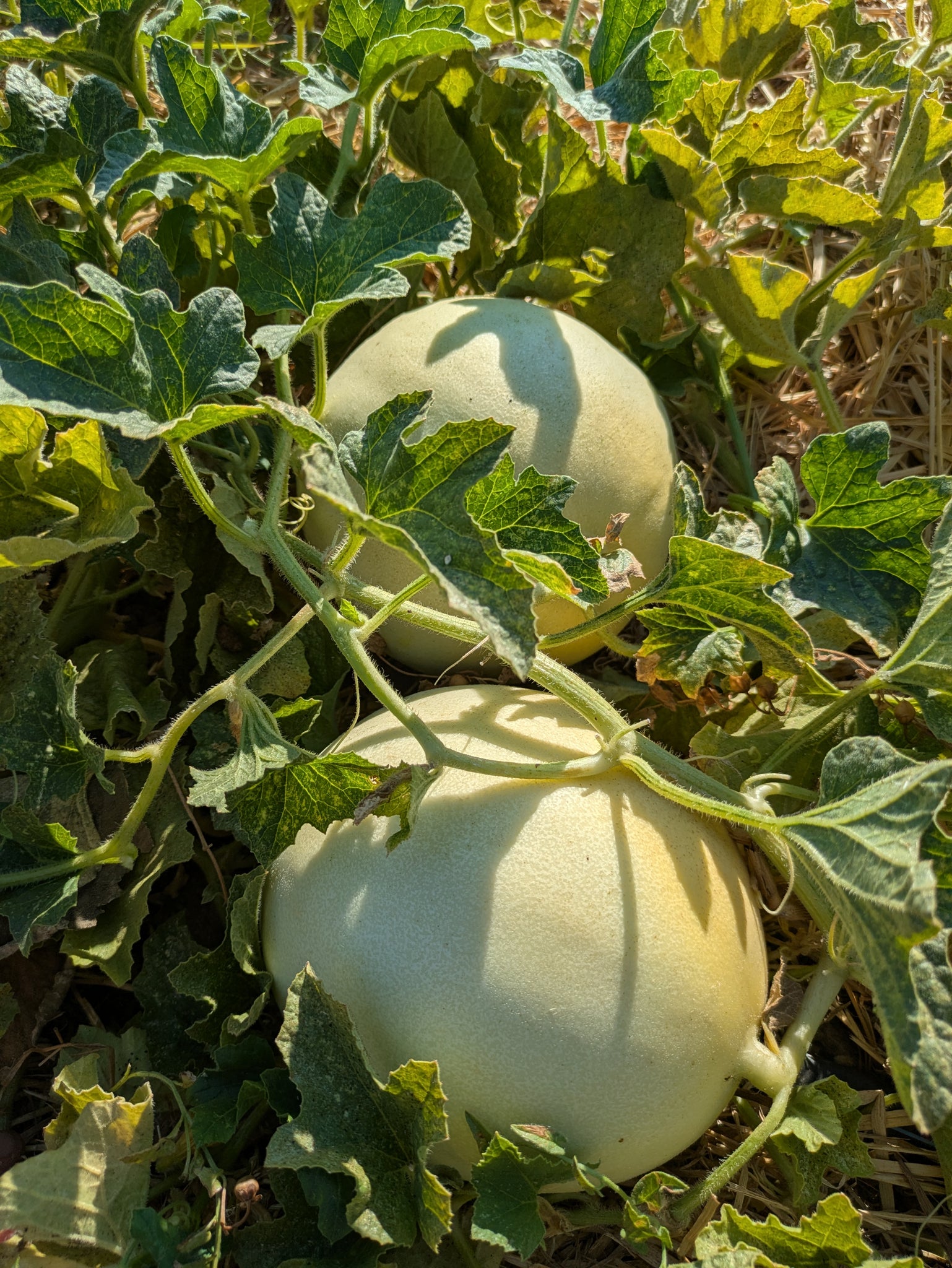 Harvest when the skin goes from pale green to pale yellow and the blossom end yields to gentle pressure. Honeydews don’t slip from the vine in the same way as canteloupes, but we have found that in peak summer these will slip from the vine but will leave a scar on the melon and should be eaten soon after. This variety will keep for several weeks in refrigeration, but we typically find ourselves eating them before that!